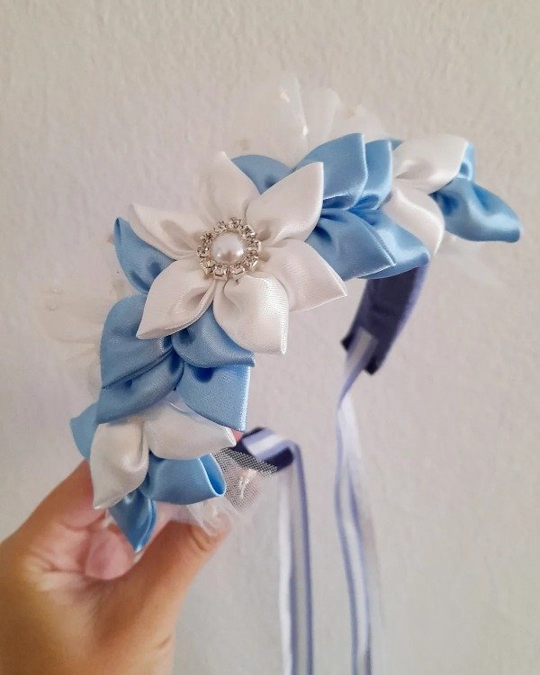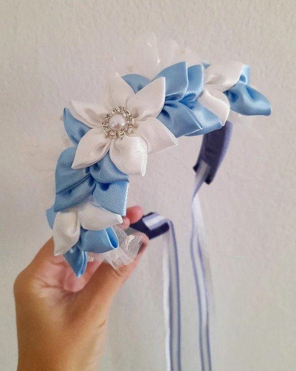 Vincha forrada en terciopelo azul con flores de raso, tul bordado y cintas bandera.-