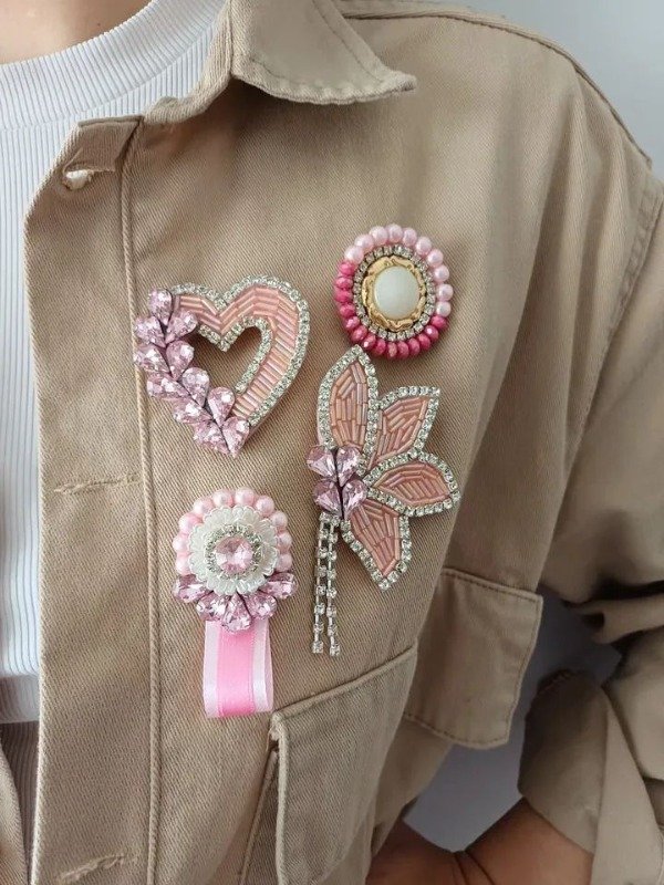 Centro del corazón bordado con canutillos rosas tornasolados.-
